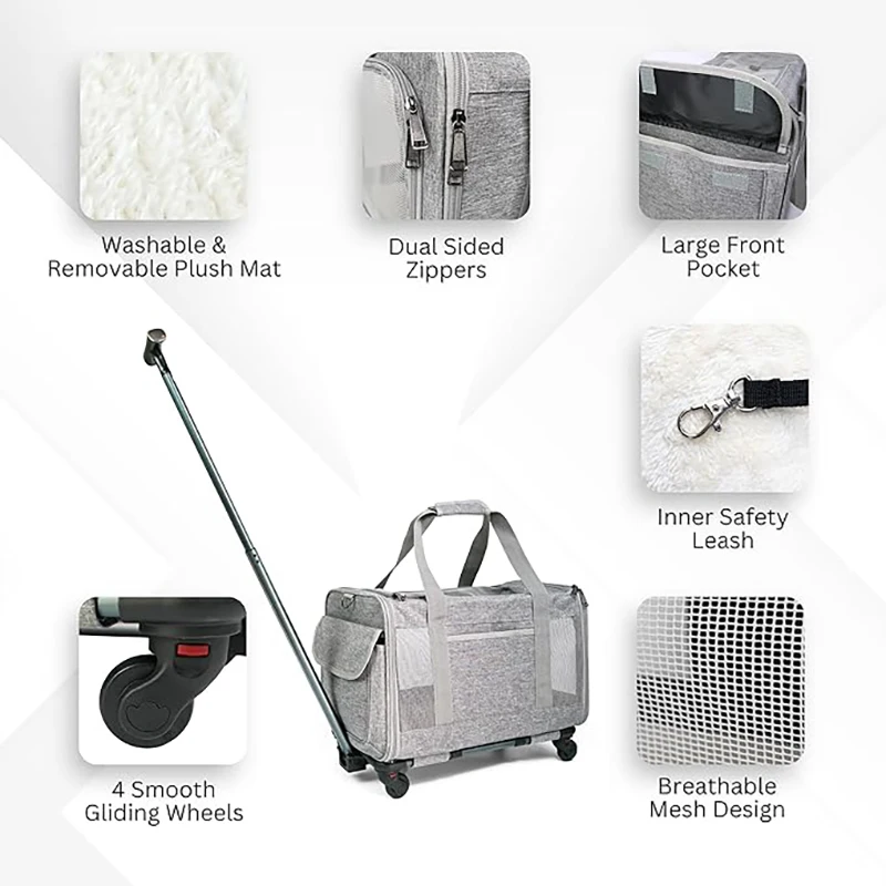 VERSATILE DESIGN: This rolling pet carrier offers multiple carrying options, including wheeling, shoulder straps, and handles for easy lifting. Whether navigating crowded spaces or lifting into vehicles, this design ensures convenience at every step.